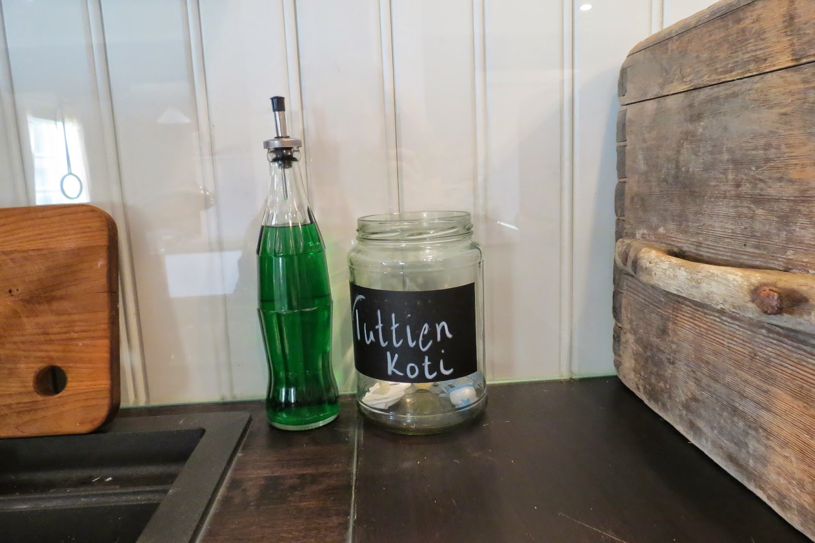 1. Käsitiskiaine uuteen pulloon! Käsitiskiainepullo ei ehkä ole keittiösi kaunistus, mutta olisi kiva pitää se aina kuitenkin käden ulottuvilla. Tässä öljypullon korkki ja lasinen kokispullo yhdistyivät esillä pidettäväksi käsitiskiainepulloksi. Tosin muovipulloa on helpompi käyttää, kun siitä voi puristaa käsitiskiaineen ulos valuttamisen sijaan.